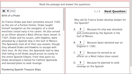 | Subject | Format | Grade Level/Lexile | Word Count | Type and Questions | Imm. Feedback? | Narration? | ||||