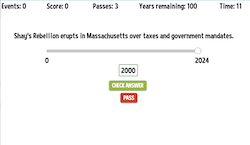 The goal of the game is to approximate (or pinpoint) the dates for as many historical events as possible. Historical events will appear randomly and players use the slider to set the date. Players have 100 years to work with. If an event occurs in 1650 and the date is set to 1640, ten years are lost. The game ends when a player has no years left.