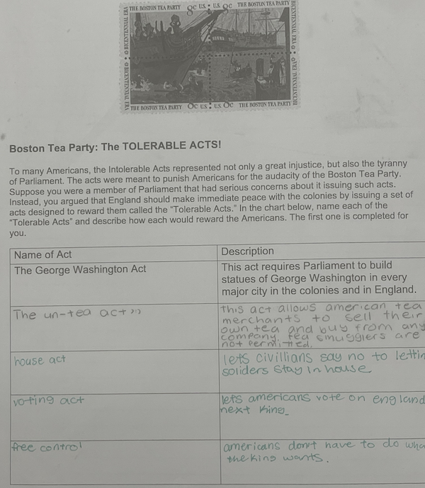 | Students play the role as a member of Parliament who has serious concerns about the Intolerable Act. Instead, he or she argues that England should make immediate peace with the colonies by issuing a set of acts designed to reward them called the “Tolerable Acts.” Students must think of five acts that reward the colonists (such as Parliament erecting a statue of George Washington in front of Buckingham Palace). |